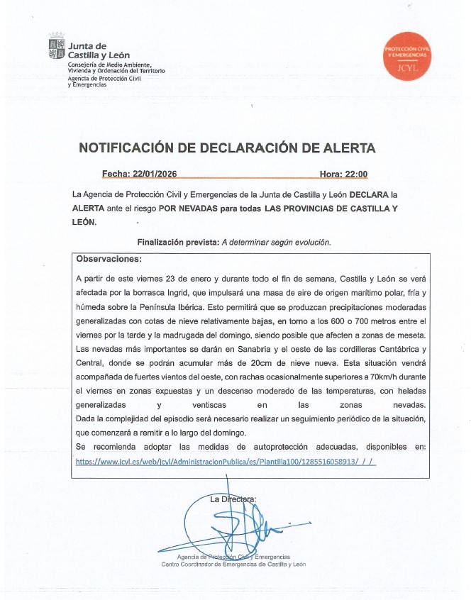 Desde la Agencia de Protección Civil y Emergencias de la Junta de Castilla y León se DECLARA LA ALERTA por el riesgo de NEVADAS en todas las provincias de Castilla y León afectadas por la borrasca Ingrid, que impulsará masa de frío polar produciéndose nevada en cotas bajas, en torno a los 600 y 700 metros entre el viernes por la tarde y la madrugada del domingo. Fecha de Inicio el 23/01/2026 y finalización prevista a determinar según evolución.