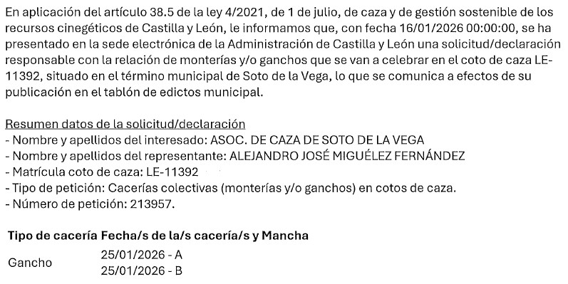 La Junta de Castilla y León nos informa que el próximo 25 de enero de 2026 se va a llevar a cabo una Montería y/o Gancho en el coto de caza LE-11392, situado en el término municipal de Soto de la Vega; interesado: ASOC. DE CAZA DE SOTO DE LA VEGA representante: ALEJANDRO JOSÉ MIGUÉLEZ FERNÁNDEZ matrícula coto de caza: LE-11392 CACERÍA COLECTIVA ( monterías y/o gancho): GANCHO 25/01/2026 A 25/01/2026 B